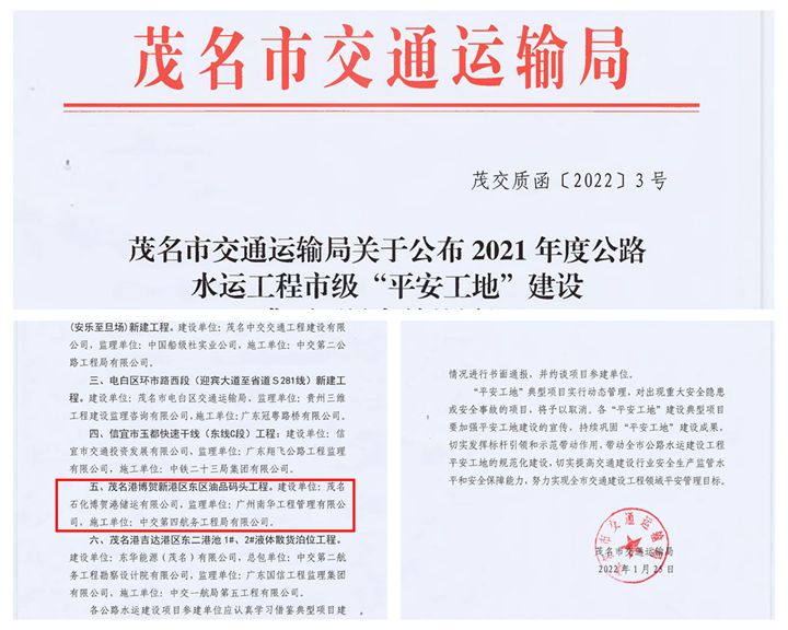 近日,茂名市交通運輸局在全市公路水運項目中部署開展平安工地建設(shè)考核工作。經(jīng)過層層遴選,茂名港博賀新港區(qū)東區(qū)油品碼頭工程再次被評為市級“平安工地”建設(shè)典型項目,連續(xù)兩年榮獲“平安工地”稱號!