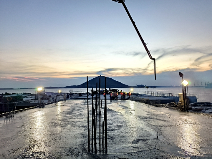 6月29日下午,茂名港博賀新港區(qū)東區(qū)油品碼頭工程水域公用管廊棧橋現(xiàn)澆面層完成澆筑,完成了油品碼頭項目公共管廊橋與碼頭全面貫通,實現(xiàn)了“海陸對接”,一舉貫通了博賀新港區(qū)的“大動脈”。