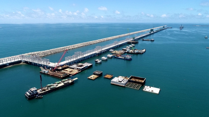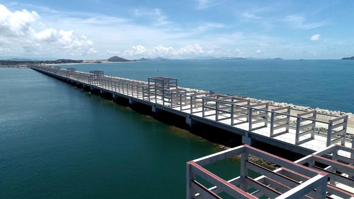 ▲茂名港務(wù)中心項目 在這乘風(fēng)破浪、跨越發(fā)展的十年里,茂名港深水大港崢嶸初現(xiàn),碩果累累——實現(xiàn)資產(chǎn)規(guī)模和融資規(guī)!半p百”目標(biāo),為濱海新區(qū)基礎(chǔ)設(shè)施建設(shè)和茂名港集團(tuán)發(fā)展提供資金保障,融資平臺作用凸顯;自建、參建省市重點項目超30個,推動博賀新港區(qū)東西防波堤、10萬噸級成品油碼頭、東區(qū)化工碼頭、東區(qū)化工倉儲、粵西LNG造陸項目、茂名港務(wù)中心、博賀灣大橋、供水工程等一批省市重點項目建設(shè)投用,充分發(fā)揮濱海新區(qū)項目建設(shè)主體作用,加快推進(jìn)口岸開放工作,為茂名經(jīng)濟(jì)實現(xiàn)高質(zhì)量發(fā)展增添動力。 前瞻布局,打造南海能源新通道,積極融入茂名“向海而興”發(fā)展大局。