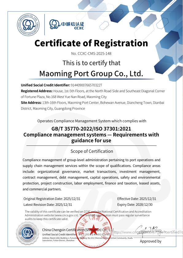 近日,茂名港集團(tuán)有限公司成功通過權(quán)威認(rèn)證機(jī)構(gòu)審核,榮獲ISO 37301:2021合規(guī)管理體系國際標(biāo)準(zhǔn)認(rèn)證與GB/T 35770-2022合規(guī)管理體系國內(nèi)標(biāo)準(zhǔn)認(rèn)證。這標(biāo)志著茂名港集團(tuán)在合規(guī)管理體系建設(shè)方面達(dá)到了國際國內(nèi)先進(jìn)水平,成為茂名市首家獲得合規(guī)管理體系認(rèn)證的市屬國有企業(yè),在企業(yè)治理現(xiàn)代化與規(guī)范化道路上邁出了具有里程碑意義的關(guān)鍵一步。