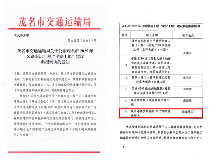 近日,茂名市交通運輸局公布2025年全市公路水運工程“平安工地”建設典型項目表彰名單,茂名港博賀新港區(qū)30萬噸級原油碼頭項目(以下簡稱“項目”)榮列其中。自2023年以來,項目已連續(xù)三年榮獲此項稱號,以三年如一日的深耕與篤行,筑牢水運工程安全防線,以標桿之姿詮釋“平安筑港”的責任擔當,成為茂名市公路水運工程安全管理領域的示范樣板。