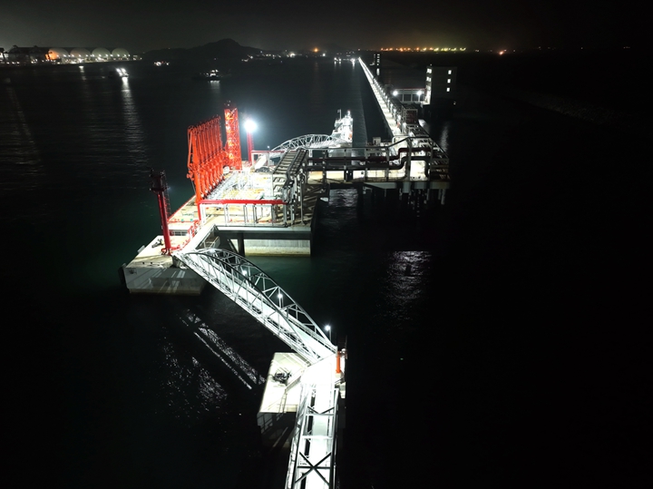 “照明合閘,開始照明系統(tǒng)全負荷24小時試運行測試”隨著對講機里面?zhèn)鞒龅闹噶,茂名港博賀新港區(qū)10萬噸級成品油碼頭項目的213盞防爆投光燈、24盞防爆路燈同時亮起,從茂名港博賀新港區(qū)的夜空俯視而下,將近5公里的公用管廊如同一條燈帶鑲嵌在港區(qū)東防波堤上,璀璨明亮。而油品碼頭E2泊位,投光燈下橙紅的裝卸臂、大紅的消防炮塔、銀色的撬式裝置、還有各色的工藝給排水管道,無一不充滿了讓人沉醉的工業(yè)美。