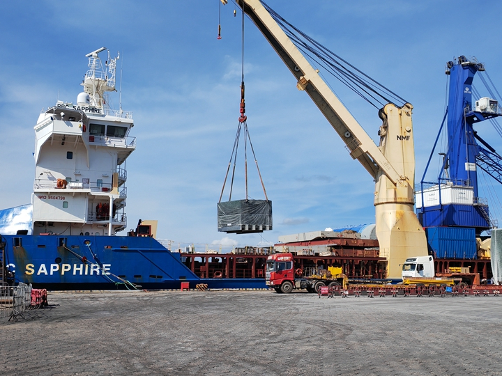 近日,外貿(mào)船舶“藍寶石”輪順利靠泊港口經(jīng)營公司碼頭裝運大型外貿(mào)設(shè)備,這是港口經(jīng)營公司今年以來首次靠泊的萬噸級外貿(mào)船舶。
