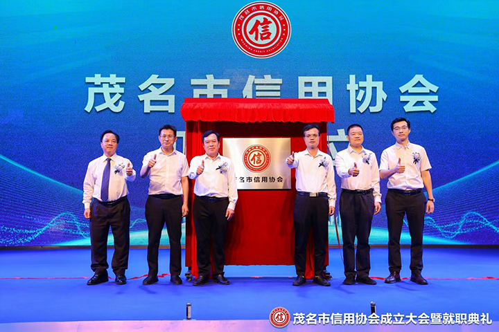 茂名市人大常委會副主任吳海強(右三),茂名市政協(xié)黨組副書記、副主席楊培基(左三),茂名市人民政府副秘書長何江(右二),茂名市發(fā)展和改革局黨組書記、局長朱春保(左二 ),廣東省發(fā)展改革委信用建設處一級主任科員譚強杰(右一),茂名市信用協(xié)會會長李文(左一)共同為茂名市信用協(xié)會揭牌。