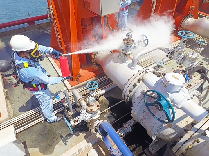 演練現(xiàn)場,警報聲響起,人員、車輛迅速集結(jié)到位。按照搶險救災組、疏散警戒組、通訊聯(lián)絡組、后勤保障組、醫(yī)療救護組、后勤醫(yī)療組等五個工作組的分工要求,參演人員各就各位、各司其責。他們有的迅速疏散無關(guān)人員完成現(xiàn)場警戒;有的迅速向市公司指揮中心及相關(guān)部門報告情況;有的迅速使用消防水泵泡沫泵、干粉滅火器撲滅初期火災,并對泊位E2裝卸區(qū)進行全面冷卻;有的迅速開展醫(yī)療及后勤等方面的應急處理。各參演小組反應快速、緊密配合、協(xié)同作戰(zhàn),現(xiàn)場警戒、人員疏散、滅火救援、后勤保障等各項應急動作有序進行,處理流程和處理措施合理有效。