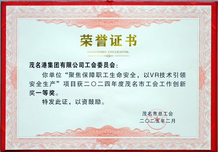 集團(tuán)VR安全體驗(yàn)館榮獲茂名市工會(huì)工作創(chuàng)新獎(jiǎng)“一等獎(jiǎng)”