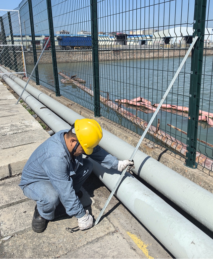 碼頭之間周界圍擋是安全管控的重要屏障,也是港口設(shè)施保安工作重要設(shè)施之一。按外委維修方案,需整體制作圍擋,費(fèi)用約8萬元。 “能不能自己干?!”黨員維修組現(xiàn)場(chǎng)測(cè)量圍擋尺寸,設(shè)計(jì)“鋼管立柱+鋼絲網(wǎng)格+防撞條”的簡(jiǎn)易圍擋方案,反復(fù)論證可行性后,決定擼起袖子自己干!為確保穩(wěn)固性,黨員維修組用水平儀一米一米測(cè)標(biāo)高,用扳手一顆一顆緊螺栓;為防臺(tái)風(fēng)天氣傾倒,把鋼管底部焊接在混凝土基座,用水平尺校準(zhǔn)“毫米級(jí)”垂直度。5天的連續(xù)作業(yè),為港口經(jīng)營公司周界圍擋起整齊牢固的“安全防線”。
