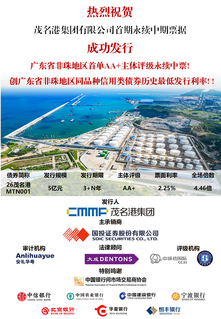 2月4日,正值立春,萬(wàn)物始新。茂名港集團(tuán)在這一天成功簿記發(fā)行5億元永續(xù)中期票據(jù),以生機(jī)盎然之勢(shì)為集團(tuán)發(fā)展注入新的蓬勃?jiǎng)恿Α1敬蝹谙逓?+N年,發(fā)行成果尤為亮眼——票面利率2.25%,全場(chǎng)認(rèn)購(gòu)倍數(shù)高達(dá)4.46倍,票面利率為茂名地區(qū)全品種債券發(fā)行最低紀(jì)錄,亦創(chuàng)下廣東省非珠地區(qū)同品種信用類債券歷史新低。